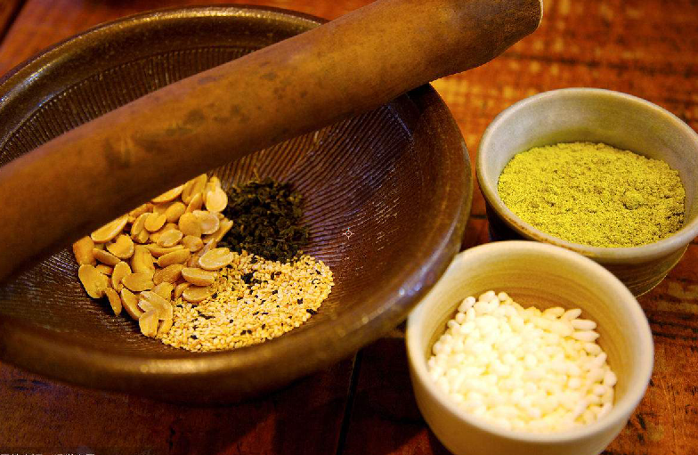 制作擂茶的过程是,先坐下,然后拿出擂钵,然后拿出擂棍,有些地方也叫做“风雷棍”。然后抓一把茶叶进去,茶叶可以是红茶,绿茶,不同茶叶也会有不同的颜色和口味。然后开始敲打,旋转。一边敲打一边放入旋转花生,芝麻等等食材等到东西捣成泥状,就放入壶中,然后擂茶就完成了,擂茶可以食用其味道芬芳,据说还有解毒的作用。